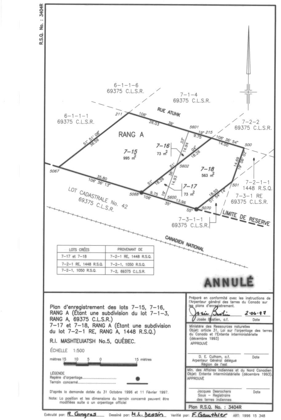 PLAN D'ENREGISTREMENT DES LOTS 7-15, 7-16 ET DES LOTS 7-17 ET 7-18, RANG A (ANNULÉ). (fra; CAN)
