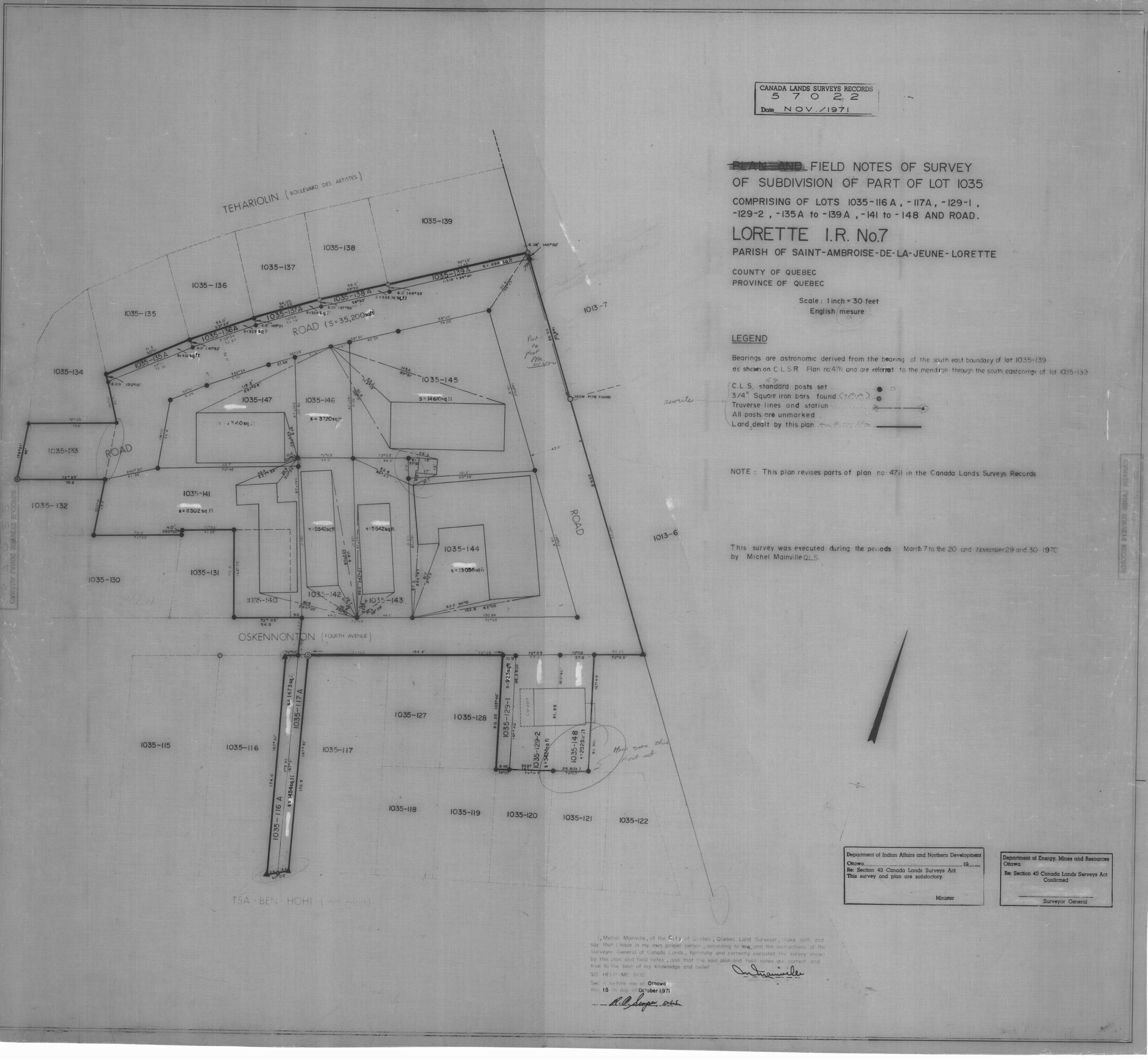 | Title | FN'S OF SURVEY OF SUBDIVISION. OF PART OF LOT 1035 COMPRISING LOTS 1035-116A, -117A, -129-1, -129-2, -135-A TO -139-A, -141 TO -148 AND ROAD, I.R. NO. 7. (eng; CAN) |